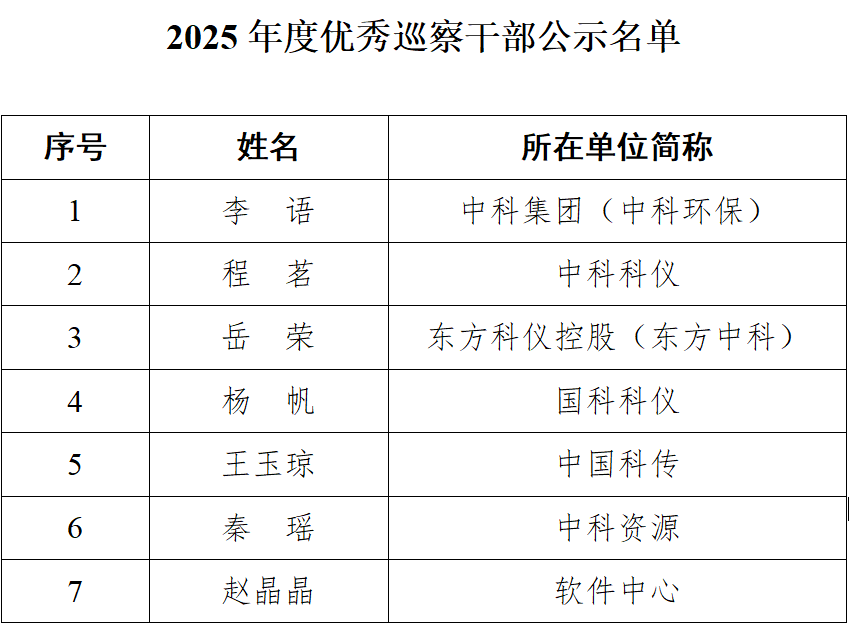 2025年,国科控股党委巡察办选调64名干部,组建了6个巡察组开展巡察工作。国科控股党委巡察工作领导小组根据各巡察组的工作成效和干部表现,评选出年度优秀巡察干部,现予以公示。